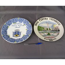 DOIS PRATOS DECORATIVOS (28X28 CM CADA), CONFECCIONADOS EM CERÂMICA. O PRIMEIRO, COM PINTURA EM TONS DE AZUL, POSSUI O BRASÃO DE PETRÓPOLIS AO CENTRO E A INSCRIÇÃO 'PETRÓPOLIS CIDADE IMPERIAL BRASIL'. O SEGUNDO, COM PINTURA RETRATANDO O CENTRO DA CIDADE, E A INSCRIÇÃO 'NOVO CENTRO HISTÓRICO / PETRÓPOLIS 2008'.