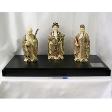 TRÊS ESCULTURAS REPRESENTANDO DEUSES CHINESES (31 CM CADA), FIXADAS EM BASE DE MADEIRA (7X83X43 CM) PINTADA DE PRETA, ONDE HÁ PLACA METÁLICA COM A INSCRIÇÃO 'KEPPEL FELS BRASIL / PRESENTED TO HIS EXCELLENCY, LUIZ INÁCIO LULA DA SILVA, PRESIDENT OF BRASIL, FROM KEPPEL FELS BRASIL ON THE OCCASION OF THE CHRISTENING OF THE P-51 / 7 OCTOBER 2008 / FU LU SHOU / THE CHINESE DEITIES - GOOD FORTUNE (FU), PROSPERITY (LU) AND LONGEVITY (SHOU) - REPRESENT THE THREE DESIRED ATTRIBUTES OF A GOOD LIFE'. POSSUI REDOMA DE ACRÍLICO, REMOVÍVEL.