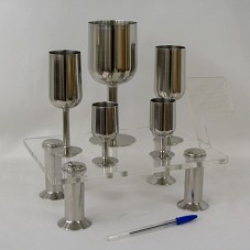 CONJUNTO DE CINCO TAÇAS EM AÇO INOX, DE TAMANHOS DIFERENCIADOS. TODAS FIXADAS EM BASE DE ACRÍLICO TRANSPARENTE (27X20 CM), COM PÉS EM AÇO. EM UMA DAS LATERAIS DA BASE, PLACA ACRÍLICA COM A GRAVAÇÃO 'AO EXMO PRESIDENTE LULA / UMA HOMENAGEM DOS METALÚRGICOS DE ANGRA DOS REIS / DIRETOR DO SINDICATO E TORNEIRO MECÃNICO / IVO JOSÉ DA SILVA / 07/10/08'.