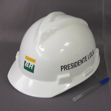 CAPACETE DE PROTEÇÃO, UTILIZADO EM CONSTRUÇÃO CIVIL, NA COR BRANCA. NA FRENTE, LOGOMARCA DA 'PETROBRÁS'.NAS LATERAIS, 'PRESIDENTE LULA'. POSSUI AJUSTES INTERNOS.