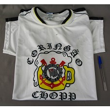 CAMISETA (TAM GG) EM MALHA BRANCA, DE MANGA CURTA, E DETALHES EM PRETO E AMARELO. CAMISETA ESTILO CAMISA DE FUTEBOL. NA FRENTE, EMBLEMA DO 'S.C. CORINTHIANS PAULISTA', DENTRO DE UMA CANECA DE CHOPE, E A INSCRIÇÃO 'CORINGÃO CHOPP'. ATRÁS, MESMA INSCRIÇÃO.