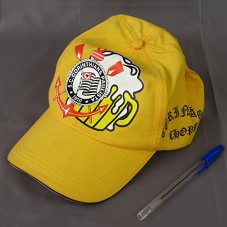 BONÉ EM TECIDO AMARELO. NA FRENTE, EMBLEMA DO 'S.C. CORINTHIANS PAULISTA', AO LADO DE UMA CANECA DE CHOPE. NAS LATERAIS, A INSCRIÇÃO 'CORINGÃO CHOPP'. ATRÁS, '1989'.