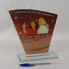 PLACA (20X20 CM) CONFECCIONADA EM VIDRO. POSSUI ESTAMPA MOSTRANDO FOTOGRAFIA DO PRESIDENTE LULA AO LADO DE LARISSA TÉRCIO, SOBRE FUNDO AVERMELHADO, E A INSCRIÇÃO 'LEMBRANÇA DO POVO MOSSOROENSE... / PORQUE VOTAR NO 40 / ... / SEJA BEM VINDO LUÍS INÁCIO LULA DA SILVA / PRESIDENTE'. FIXADA EM BASE DE MESMO MATERIAL.