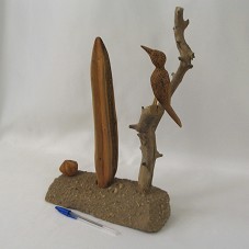 ESCULTURA / ARTESANATO (38X24X15 CM) RETRATANDO UM PÁSSARO SOBRE UM GALHO DE ÁRVORE. À SUA FRENTE, UM PÉ DE MANDACARU/CACTO E UMA FLOR. FIXADOS EM BASE DE MADEIRA REVESTIDA COM PEDRISCOS. NO FUNDO DA BASE, A INSCRIÇÃO 'JP ARTES / PÃO DE AÇÚCAR-AL'.