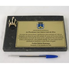 PLACA (10X15CM) EM METAL DOURADO. POSSUI A INSCRIÇÃO 'PREFEITURA DE PETRÓPOLIS / AO PRESIDENTE LUIZ INÁCIO LULA DA SILVA / EM NOME DOS PETROPOLITANOS, AGRADECEMOS PELA INSTALAÇÃO DO CEFET EM PETRÓPOLIS, NA CERTEZA DE QUE ESSA UNIDADE DE ENSINO DO GOVERNO FEDERAL CONTRIBUIRÁ PARA A FORMAÇÃO DE NOSSOS JOVENS, GARANTINDO-LHES UMA FORMAÇÃO SÓLIDA E, PRINCIPALMENTE, O TÃO SONHADO EMPREGO. EM NOME DESSES FUTUROS TRABALHADORES BRASILEIROS, O NOSSO MUITO OBRIGADO / PREFEITO RUBENS BOMTEMPO / PETRÓPOLIS, 13 DE SETEMBRO DE 2008'. FIXADA EM BASE DE GRANITO PRETO (13X19,5 CM). FIXADA NO CANTO SUPERIOR ESQUERDO DA BASE, UMA MINIATURA DE COROA, EM METAL DOURADO, COM PEDRAS IMITANDO DIAMANTE, E PARTE INTERNA EM VELUDO VERDE. ACONDICIONADA EM ESTOJO FORRADO DE LYCRA PRETA.