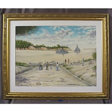 QUADRO (83X102,5 CM) COM MOLDURA DOURADA E PASSE-PARTOUT BRANCO. EMOLDURA PINTURA SOBRE TELA RETRATANDO AS MARGENS DE UM RIO, ONDE ALGUMAS PESSOAS OBSERVAM DUAS EMBARCAÇÕES DA MARINHA. PREDOMINA TONS PASTÉIS E VERDES. NO CANTO INFERIOR ESQUERDO, ASSINATURA DO ARTISTA 'PAULO CÉSAR / EM 10/11/2007 / COARI-AM'. NO REVERSO, A INSCRIÇÃO 'ÓLEO SOBRE TELA / ENTRE PRAIAS E RIOS MARINHA DO BRASIL / ARTISTA: PAULO CÉSAR SILVA DE MOURA / ASS.: PAULO CÉSAR / EM 10/11/2007 / COARI-AM'.