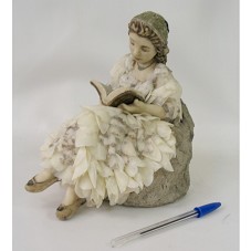 ARTESANATO (18,5X16X13 CM) CONFECCIONADO EM RESINA E RESTOS MARINHOS (CONCHAS, ESCAMAS, ETC.), MOSTRANDO UMA MOÇA, SENTADA EM UMA CADEIRA, LENDO UM LIVRO. NO FUNDO DA BASE (UMA GRANDE CONCHA), A INSCRIÇÃO 'LEITURA / POR MARTA ROCHA'.