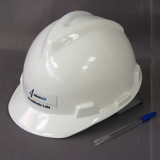 CAPACETE DE PROTEÇÃO, UTILIZADO EM CONSTRUÇÃO CIVIL, NA COR BRANCA. NA FRENTE, LOGOMARCA E NOME DO 'ESTALEIRO ATLÂNTICO SUL' E 'PRESIDENTE LULA'.