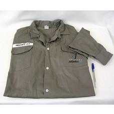 JAQUETA (TAM 7), EM BRIM CINZA, DE MANGA CUMPRIDA E ELÁSTICO NA BARRA POSTERIOR. POSSUI DOIS BOLSOS FRONTAIS E FECHAMENTO EM BOTÃO. EM UM DOS BOLSOS, BORDADO EM AZUL, BRANCO E PRETO, LOGOMARCA E NOME DO 'ESTALEIRO ATLÂNTICO SUL'; NO OUTRO, EM VELCRO, 'PRESIDENTE LULA'. ATRÁS, NOME E LOGOMARCA DA EMPRESA.