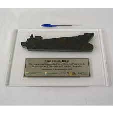 PLACA (6,8X20,5 CM) EM METAL PRATEADO, CONTENDO A INSCRIÇÃO 'BONS VENTOS, BRASIL / COMEÇA A CONSTRUÇÃO DO PRIMEIRO NAVIO DO PROGRAMA DE MODERNIZAÇÃO E EXPANSÃO DA FROTA DA TRANSPETRO / PERNAMBUCO, 5 DE SETEMBRO DE 2008' E LOGOMARCAS DAS INSTITUIÇÕES 'TRANSPETRO / PETROBRÁS / MINISTÉRIO DAS MINAS E ENERGIA / GOVERNO FEDERAL / PAC'. FIXADA EM BASE (21X31 CM) DE ACRÍLICO. ACIMA DA PLACA METÁLICA, RECORTADO EM AÇO, ESCULTURA (7X24 CM) BIDIMENSIONAL NO FORMATO DE UM NAVIO.