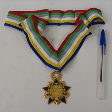 MEDALHA DE OURO DA 'AMERICA'S SOCIETY (SOCIEDADE DAS AMÉRICAS) E 'COUNCIL OF THE AMERICA'S' (CONSELHO DAS AMÉRICAS). CONFECCIONADA EM METAL DOURADO FOSCO, ESTRELA DE CINCO PONTAS AZUIS, COM UM BRASÃO AO CENTRO. ESTE POSSUI DESENHOS DE VINTE E UM BRASÕES DE PAÍSES DA AMÉRICA. NO REVERSO, A GRAVAÇÃO 'H.E. LUIZ INÁCIO LULA DA SILVA / SEPTEMBER, 22, 2008'. FIXADA EM FITA COM LISTRAS NAS CORES VERMELHO, VERDE, CINZA, BRANCO, AMARELO E AZUL. ACONDICIONADA EM ESTOJO DE COURO MARROM, COM A INSCRIÇÃO 'BAILEY BANKS & BIDDLE', NA PARTE FRONTAL.