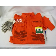 MACACÃO / UNIFORME (TAM GG) EM TECIDO LARANJA, DE MANGA COMPRIDA. POSSUI QUATRO BOLSOS FRONTAIS. ABAIXO DOS DOIS BOLSOS SUPERIORES, MARCA DAS MÃOS DO PRESIDENTE LULA, FEITAS COM AMOSTRA DO ÓLEO; ACIMA, BORDADO COM A INSCRIÇÃO 'FPSO PRES. JUSCELINO KUBITSCHEK / A CHEGADA DE UMA NOVA ERA / PRESIDENTE LULA' E LOGOMARCA DA PETROBRÁS E 'RF'. ACOMPANHA UM PAR DE LUVAS EM ALGODÃO CRU, COM UM DOS LADOS EMBORRACHADO.