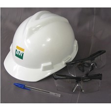 CAPACETE DE PROTEÇÃO, UTILIZADO EM CONSTRUÇÃO CIVIL, NA COR BRANCA. NA FRENTE, LOGOMARCA DA 'PETROBRÁS'. POSSUI AJUSTES INTERNOS. ACOMPANHA DOIS ÓCULOS DE PROTEÇÃO, COM LENTES EM PLÁSTICO TRANSPARENTE E ARMAÇÃO PRETA.