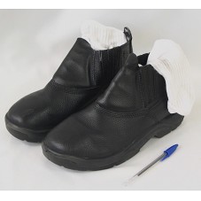 PAR DE BOTINAS (TAM 41) EM COURO PRETO, DE CANO CURTO. ACOMPANHA UM PAR DE MEIAS BRANCAS USADAS, EM ALGODÃO.