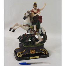 ESCULTURA (26X17X9 CM) EM RESINA, IMAGEM DE SÃO JORGE MONTADO EM SEU CAVALO, COM UM DRAGÃO SOB AS PATAS DO MESMO. FIXADA EM BASE DE MADEIRA, ONDE HÁ PLAQUETA COM A INSCRIÇÃO 'SÃO JORGE'. NO FUNDO DA BASE, ETIQUETA DO FABRICANTE.
