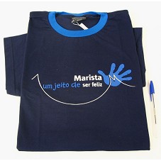 CAMISETA (TAM XG) EM MALHA AZUL MARINHO, COM DETALHE AZUL MAIS CLARO NA GOLA. NA FRENTE, ESTAMPA EM TOM DE AZUL E BRANCO, COM A INSCRIÇÃO 'MARISTA UM JEITO DE SER FELIZ', E DESENHO DE UMA MÃO.