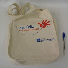 SACOLA (35X28X8 CM) EM ALGODÃO CRU, COM ALÇA CURTA. NA FRENTE, ESTAMPA EM TOM DE AZUL E VERMELHO, COM A INSCRIÇÃO 'SER FELIZ ESTÁ EM NOSSAS MÃOS / COLÉGIO MARISTA IPANEMA', DESENHO DE UMA MÃO E LOGOMARCA DA INSTITUIÇÃO.