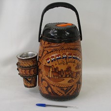 GARRAFA TÉRMICA EM PLÁSTICO LARANJA, REVESTIDA EXTERNAMENTE EM COURO. POSSUI TAMPA COM ROSCA, E NA PARTE SUPERIOR DESSA, BICO PARA DESPEJAR A BEBIDA. REVESTIMENTO DE COURO COM DUAS ALÇAS E, NA LATERAL, ALÇA ONDE ESTÁ ENCAIXADO COPO DE ALUMÍNIO COM MESMO REVESTIMENTO. NA PARTE FRONTAL, A INSCRIÇÃO 'PARAGUAI / LUIS I. LULA' E DESENHO. COURO TRABALHADO COM MOTIVOS DE ARABESCOS.
