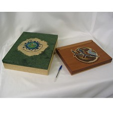 RISQUE-RABISQUE (27X32,5X4 CM) CONFECCIONADO EM MADEIRA. NA TAMPA, TRABALHO EM MARCHETARIA, MOSTRANDO DUAS ARARAS VOANDO SOBRE A AMAZÔNIA. TRABALHO FAZ PARTE DA COLEÇÃO 'PÁSSAROS, FLORES E PAISAGENS DA AMAZÕNIA'. NA PARTE INTERNA, LOGOMARCA DA 'SUFRAMA', 'GOVERNO FEDERAL' E O NOME 'MINISTÉRIO DO DESENVOLVIMENTO, INDÚSTRIA E COMÉRCIO EXTERIOR'. FOLHAS EM PAPEL RECICLADO, COM AS MESMAS LOGOMARCAS. NA PRIMEIRA FOLHA, DESCRIÇÃO DA PEÇA. ACONDICIONADA EM ESTOJO (30X37X8 CM) DE MADEIRA FORRADO COM PAPEL ARTESANAL, TENDO LOGOMARCA DA FEIRA 'IV FEIRA INTERNACIONAL DA AMAZÔNIA' NA TAMPA.