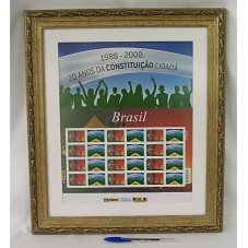 CINCO QUADROS IGUAIS (46X40 CM CADA) EMOLDURANDO DOZE PARES DO SELO POSTAL COMEMORATIVO AOS '20 ANOS DA CONSTITUIÇÃO CIDADÃ'. AO FUNDO, EM ESCALA MAIOR, ESTAMPA DOS DOIS SELOS. POSSUI MOLDURA EM MADEIRA TRABALHADA E PINTADA DE DOURADO, E PASSE-PARTOUT BRANCO. NA PARTE INFERIOR, LOGOMARCA DOS 'CORREIOS', 'GOVERNO FEDERAL' E 'MINISTÉRIO DAS COMUNICAÇÕES'.