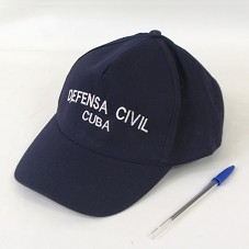 BONÉ EM BRIM AZUL MARINHO. NA FRENTE, BORDADO EM BRANCO, A INSCRIÇÃO 'DEFENSA CIVIL / CUBA'.