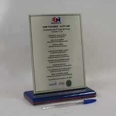 PLACA (20X15 CM) EM AÇO ESCOVADO. POSSUI A LOGOMARCA E NOME DA 'ELETRONORTE', E A INSCRIÇÃO 'UHE TUCURUÍ - 8.370MW / CONCLUSÃO DA 2ª CASA DE FORÇA / UNIDADES 13 A 23 / ... / TUCURUÍ-PA, 04 DE NOVEMBRO DE 2008'. POSSUI GRAVADOS OS NOMES DE AUTORIDADES BRASILEIRAS, ENTRE ELES, O DO PRESIDENTE LULA. FIXADA EM BASE DE ACRÍLICO AZUL, COM FRISO VERMELHO.