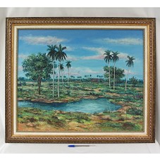QUADRO (68X81 CM) EMOLDURANDO PINTURA SOBRE TELA (54,5X67,5 CM) RETRATANDO UMA PAISAGEM. EM PRIMEIRO PLANO, UM RIACHO, COM ALGUMAS PALMEIRAS, E, AO FUNDO, UMA CABANA. PREDOMINA TONS DE VERDE E AZUL. NO CANTO INFERIOR DIREITO, ASSINATURA DO ARTISTA 'RENATO MOEZ TORRES / 2008'. MOLDURA TRABALHADA EM MADEIRA DOURADA, COM PASSE-PARTOUT BRANCO DE FRISO DOURADO. ACOMPANHA CARTÃO COM NOME DO AGENTE.