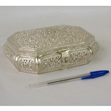 PORTA-JÓIAS (4,5X16X13 CM) OITAVADO, CONFECCIONADO EM PRATA. POSSUI TODAS AS FACES TRABALHADAS COM MOTIVOS FLORAIS E FECHO DE ENCAIXE. ACONDICIONADO EM SACO DE CETIM, E ESTE EM ESTOJO FORRADO DE VELUDO BEGE. ACOMPANHA CARTÃO DO AGENTE.