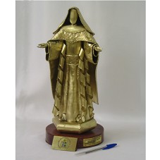 ESCULTURA (36 CM) EM METAL PINTADO DE DOURADO, REPRESENTANDO IMAGEM DE 'NOSSA SENHORA DA MISERICÓRDIA'. NAS COSTAS DA SANTA, GRAVADA NO MANTO, A INSCRIÇÃO 'TATTI MORENO / N. SRA. MISERICÓRDIA / BA 08'. FIXADA EM BASE CIRCULAR DE MADEIRA (3X17X17 CM), TENDO NA FRENTE DESTA, PLACA COM O BRASÃO DA 'SANTA CASA DA MISERICÓRDIA DA BAHIA / 1549'. NAS LATERAIS PLACAS COM A GRAVAÇÃO 'HOMENAGEM AO EXCELENTÍSSIMO SENHOR LUIZ INÁCIO LULA DA SILVA, PRESIDENTE DA REPÚBLICA DO BRASIL. NONA CIMEIRA, SALVADOR, 28.10.2008' E 'PROVEDOR ÁLVARO LEMOS'.