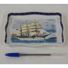 BANDEJA PORTA-CARTÃO (2X16,3X12,8 CM) EM PORCELANA BRANCA. POSSUI PINTURA Á ÓLEO RETRATANDO O NAVIO ESCOLA 'SAGRES' NAVEGANDO. POSSUI BORDAS ELEVADAS E PINTADAS DE AZUL COM DETALHES EM DOURADO. NO REVERSO, MANUSCRITO 'OFERTA A S. EXA. O SR. PRESIDENTE LULA DA SILVA DO COMANDANTE E GUARNIÇÃO DO N.R.P. 'SAGRES' POR OCASIÃO DA HONROSA VISITA A BORDO EM 28 DE OUTUBRO DE 2008. / O COMANDANTE PROENÇA MENDES CFR / SALVADOR DA BAIA, 28 DE OUTUBRO DE 2008'. E, AINDA, GRAVADO EM AZUL, DADOS DA PEÇA 'ÓLEO ROGER CHAPELET / SAGRES EM PORTO SANTO / EDIÇÃO EXCLUSIVA / NRP SAGRES / PORTUGAL'.