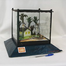 MAQUETE (21X22X22 CM) REPRESENTANDO A ENERGIA ELÉTRICA CHEGANDO A UMA CASA, ATRAVÉS DE UM POSTE DE ENERGIA. CASA SITUADA ENTRE PALMEIRAS, COM UM RIO À SUA FRENTE. POSSUI REDOMA DE VIDRO. FIXADA SOBRE BASE TRAPEZOIDAL, ONDE HÁ ETIQUETA COM A GRAVAÇÃO 'PROGRAMA LUZ PARA TODOS', E NOME DO ARTISTA 'MARGALHO AÇU'.
