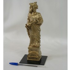 PRÊMIO JANUS. ESCULTURA EM GESSO (23,5 CM), PINTADA DE DOURADO, REPRESENTANDO UMA PESSOA COM DUAS FACES (UMA MASCULINA E OUTRA FEMININA) OLHANDO PARA LADOS OPOSTOS, SEGURANDO UMA AMPULHETA, VESTINDO TRAJES ROMANOS. ESTÁ SOB PEDESTAL DE MESMO MATERIAL, ONDE HÁ A INSCRIÇÃO 'PREMIO JANUS / LEA-USP-SC'. FIXADA EM BASE METÁLICA PRETA.
