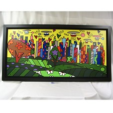 QUADRO (90x173 CM) COM MOLDURA PRETA E PASSE-PARTOUT EM TECIDO PRETO. EMOLDURA PINTURA SOBRE TELA (75x159CM), EM COMEMORAÇÃO AOS 450 ANOS DA CIDADE DE SÃO PAULO. PINTURA SOBRE FUNDO AMARELO, TRAÇANDO O PERFIL DA CIDADE, CHEIA DE PRÉDIOS COLORIDOS; E, NO CÉU, HELICÓPTEROS E O NÚMERO '450' REPETIDAMENTE. NO CANTO INFERIOR ESQUERDO, ASSINATURA DO ARTISTA 'R. BRITTO'. NO DIREITO, NÚMERO DA TELA '4/60'.