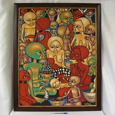 QUADRO (100X80 CM) EMOLDURANDO PINTURA SOBRE TELA(89X69 CM) RETRATANDO DIVERSAS PESSOAS, HOMENS, MULHERES E CRIANÇAS, SENTADOS, ENTREOLHANDO-SE. EM PRIMEIRO PLANO, UM CASAL, ONDE O HOMEM ESTÁ OFERTANDO À MULHER UMA TIGELA COM ALGO DENTRO. PREDOMINA TONS DE MARROM E VERMELHO. NO CANTO INFERIOR DIREITO, ASSINATURA DO ARTISTA, 'MAUKUU 07'. POSSUI MOLDURA EM MADEIRA ESCURA COM FRISO DOURADO.