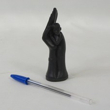ESCULTURA (11 CM) CONFECCIONADA EM MADEIRA. REPRESENTA UMA PESSOA, EM PÉ, ACONCHEGADA NUMA GRANDE MÃO.