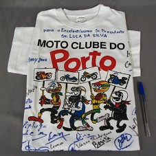 CAMISETA (TAM M) EM MALHA BRANCA, DE MANGA CURTA. NA FRENTE, DESENHO DE QUATRO MOTOQUEIROS CARREGANDO PLACAS COM FIGURAS DE MOTOS, E A INSCRIÇÃO 'MOTO CLUBE DO PORTO'. ATRÁS, 'WWW.MOTOCLUBEDOPORTO.PT / PORTUGAL'. POSSUI NA PARTE FRONTAL, A DEDICATÓRIA 'PARA O EXCELENTÍSSIMO SR. PRESIDENTE SR. LULA DA SILVA' E DIVERSAS ASSINATURAS.