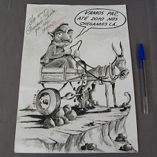CARICATURA (31,5X22 CM) EM PRETO E BRANCO, EM CARTOLINA BRANCA, REPRESENTANDO O PRESIDENTE LULA, EM UMA CARROÇA, CONDUZINDO UM JEGUE E FALANDO 'VAMOS PAC, ATÉ 2010 NÓS CHEGAMOS LÁ...'. AO LADO DA RODA, ASSINATURA DO ARTISTA 'MORENO - 08'. NA PARTE SUPERIOR, DEDICATÓRIA 'AO AMIGO PRESIDENTE LULA, GDE ABÇ MORENO / CIA BRASÍLIA 2008'. NO REVERSO, CARIMBO COM DADOS DO AGENTE. ACONDICIONADO EM SACO PLÁSTICO.