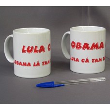 CONJUNTO DE QUATRO CANECAS DE CERÂMICA BRANCA, COM DIZERES EM VERMELHO. EM DUAS DELAS, A INSCRIÇÃO 'LULA CÁ... / ...OBAMA LÁ TAM TAM TAM TÁ?'; NAS OUTRAS DUAS, 'OBAMA LÁ... / LULA CÁ TAM TAM TAM TÁ?'. ACONDICIONADAS SEPARADAMENTE EM CAIXA DE PAPELÃO BRANCO, COM ETIQUETA DO FABRICANTE. ESTAS, EM SACOLA COM PROPAGANDA DO GOVERNO DO ESTADO DO RIO GRANDE DO SUL. ACOMPANHA CARTÃO DE VISITA DO AGENTE.
