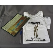 CAMISETA (TAM G) EM MALHA BRANCA, DE MANGA CURTA. NA FRENTE, ESTAMPA COM FOTOGRAFIA DE UMA ESTÁTUA, E A INSCRIÇÃO'UMA / UNIDADE DE MOBILIZAÇÃO NACIONAL PELA ANISTIA / NOSSO PATRONO O MARINHEIRO JOÃO CÂNDIDO'. NAS MANGAS, BANDEIRA DO BRASIL E LOGOMARCA DA ORGANIZAÇÃO. ACOMPANHA PASTA EM TECIDO, EM TONS DE VERDE, COM NOME E LOGOMARCA DA ORGANIZAÇÃO NA PARTE FRONTAL.