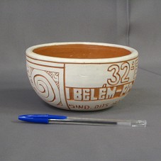 TIGELA (7X14X14 CM) PEQUENA E FUNDA, CONFECCIONADA EM ARGILA. POSSUI, EM UMA DAS LATERAIS, DESENHO ESTILO MARAJOARA; E, NA OUTRA, A INSCRIÇÃO '32º ENSA / BELÉM - PA - NOV/2008 / SIND. DOS ARQUITETOS DO PARÁ'. PARTE EXTERNA PINTADA EM TOM CLARO; INTERNA EM MARROM.