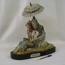 ESCULTURA (33X34X14 CM) EM CERÂMICA. REPRESENTA UMA MULHER SENTADA SE OLHANDO EM UM ESPELHO, E UM HOMEM MEIO DEBRUÇADO SOBRE ELA. A MULHER POSSUI ORNAMENTOS METÁLICOS NA CABEÇA E BRINCOS. AMBOS ESTÃO SOB UMA SOMBRINHA E VESTIDOS DE FORMA CARACTERÍSTICA. SOMBRINHA ENCAIXADA EM HASTE METÁLICA E ESTA NA BASE. PREDOMINA TONS DE VERDE, AZUL, CINZA E MARROM. FIXADA EM BASE DE MADEIRA PRETA, ONDE HÁ PLACA COM A INSCRIÇÃO 'NGILON BARENG'. ACOMPANHA CARTÃO EM NOME DO AGENTE. ACONDICIONADA EM CAIXA DE PAPELÃO, COM NOME DO FABRICANTE NA TAMPA.