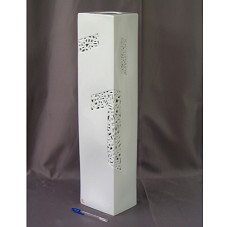 VASO DECORATIVO (63,5X15X13 CM), DE FORMATO RETANGULAR, EM CERÂMICA BRANCA ESMALTADA. POSSUI DESENHOS VAZADOS, EM DUAS LATERAIS, FORMADOS POR NÚMEROS E LETRAS. NA PARTE INFERIOR DE UMA DAS LATERAIS, CARIMBO VERMELHO COM IDEOGRAMAS COREANOS. ACONDICIONADO EM CAIXA DE MADEIRA, COM IDEOGRAMAS NA TAMPA.