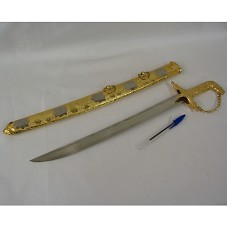 ESPADA / ADAGA (50 CM) COM LÂMINA EM METAL PRATEADO, SEM FIO, E PUNHO EM METAL DOURADO TRABALHADO. ACOMPANHA BAINHA (46,5 CM) EM MADEIRA REVESTIDA COM METAL DOURADO. ESTE POSSUI DESENHOS DE FLORES PRATEADAS E DUAS ARGOLAS EM UMA DAS LATERAIS.