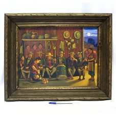 QUADRO (43,5X53,5 CM) COM MOLDURA EM MADEIRA ENTALHADA. EMOLDURA PINTURA SOBRE TELA (29,5X39,5 CM) RETRATANDO UM CONJUNTO DE MÚSICOS TOCANDO EM UMA CASA E SENDO SERVIDOS COM ÁGUA POR DUAS MOÇAS. PREDOMINA TONS ESCUROS EM TONS DE MARROM E AMARELO. NO CANTO INFERIOR ESQUERDO, ASSINATURA DO ARTISTA '4-2-08 / IVAN GABRIEL / COMALAPA'.