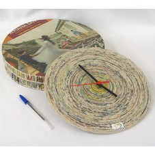 RELÓGIO DE PAREDE (26,5 CM), DE FORMATO CIRCULAR, CONFECCIONADO COM TIRAS DE JORNAL E REVISTAS COLADAS ENTRE SI E ENVERNIZADAS. ACONDICIONADO EM CAIXA DE MESMO MATERIAL. POSSUI ETIQUETA COM NOME DO FABRICANTE.