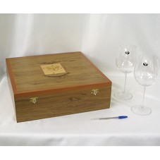 ESTOJO EM MADEIRA (12X38X38 CM) FORRADO INTERNAMENTE DE VELUDO VINHO. NA TAMPA, BRASÃO DO 'COMANDO DA AERONÁUTICA'. ACONDICIONA DUAS TAÇAS PARA VINHO, EM CRISTAL, COM O MESMO BRASÃO GRAVADO NELAS. NO INTERIOR, ESPAÇO PARA GARRAFA DE VINHO (NÃO CHEGOU A ESTA DDH).