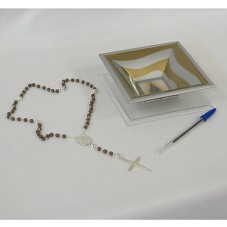 TERÇO RELIGIOSO COM CONTAS EM MADEIRA, CRUCIFIXO EM METAL PRATEADO E MEDALHA EM MESMO MATERIAL, TENDO NO ANVERSO, DESENHO DE UMA FLOR COM A INSCRIÇÃO 'TERÇO OFICIAL SANTUÁRIO NACIONAL DE APARECIDA'; NO REVERSO, IMAGEM DE NOSSA SENHORA APARECIDA. ACOMPANHA OBJETO DE FORMATO QUADRANGULAR E FUNDO, EM PLÁSTICO TRANSPARENTE, COM BASE EM MESMO MATERIAL. POSSUI NA PARTE INTERNA, PINTURA EM DOURADO E PRATEADO, E NO FUNDO, IMAGEM DE NOSSA SENHORA APARECIDA.