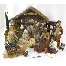 PRESÉPIO COMPOSTO POR: CENÁRIO DE DUAS PARTES (47X46X12,5 CM E 28,5X17X9,5 CM) FIGURANDO PARTE DO ESTÁBULO; UM CIPRESTE; ONZE FIGURAS (MARIA, JOSÉ, JESUS, OS TRÊS REIS MAGOS, UM PASTOR, UM ANJO, UMA VACA, UMA OVELHA E UM CAMELO); A MANJEDOURA; DOIS VASOS CERÂMICOS E UM BAÚ CHEIO DE JÓIAS. ACOMPANHA PEQUENA LÂMPADA. ACONDICIONADOS EM CAIXA DE PAPELÃO COM FOTOGRAFIA DO PRESÉPIO.