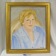 PINTURA (59,5X49 CM) SOBRE MADEIRA RETRATANDO A PRIMEIRA-DAMA MARISA LETÍCIA, SOBRE FUNDO CINZA. POSSUI BRINCOS E COLAR EM CONTAS DE PÉROLA ARTIFICIAL. NO CANTO INFERIOR DIREITO, ASSINATURA DO ARTISTA 'MAERCIO MAZZI 2008'. POSSUI MOLDURA (73X62 CM) EM MADEIRA DOURADA. NA PARTE POSTERIOR, PAPEL COLADO COM DADOS DO ARTISTA.