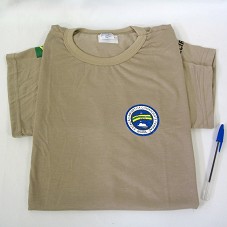 CAMISETA (TAM M) EM MALHA MARROM, DE MANGA CURTA. NA FRENTE, ESTAMPA COM LOGOMARCA DA 'ESTAÇÃO ANTÁRTICA COMANDANTE FERRAZ / BRASIL'. NAS MANGAS, BANDEIRA DO BRASIL E 'SECIRM'. ATRÁS, 'MARINHA DO BRASIL'. ACONDICIONADA EM SACO DE TNT AMARELO, COM MESMA LOGOMARCA NA FRENTE.